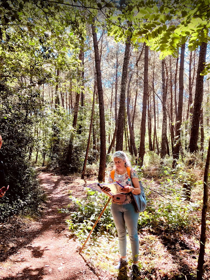 Géraldine, notre guide, oeuvre dans le cadre de l’association La Fresque Océane: elle est engagée dans un travail de sensibilisation autour de la préservation des océans. Comme elle l’a rappelé au départ de la marche, tout va à l’océan ! Le guitard, réduit à un mince filet d’eau à cette période de l’année et au lit très encaissé et sinueux, nous a offert ses berges délicieusement ombragés pour cheminer vers l’estuaire puis l’océan lointain où ses eaux inéluctablement se jettent.