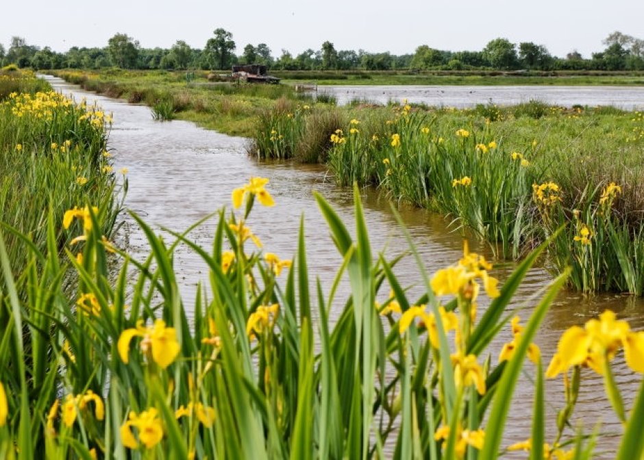 Les traces d’empreintes de mammifères étaient nombreuses et bien visibles grâce au sol argileux assoupli par la pluie de la veille. Les iris d’eau commencent à fleurir et à colorer de jaune les étendues plates où croissent les joncs et les ronciers.
